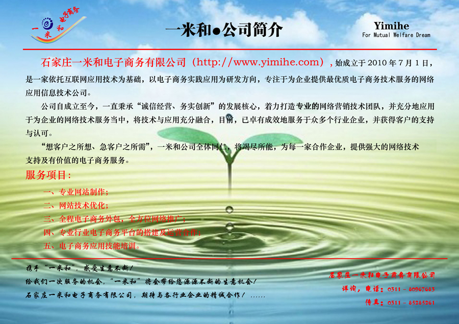 石家莊一米和電子商務有限公司(http://www.eyuedui.com),始成立于2010年7月1日,是一家依托互聯(lián)網應用技術為基礎,以電子商務實踐應用為研發(fā)方向,專注于為企業(yè)提供優(yōu)質電子商務技術服務的網絡應用信息技術公司。